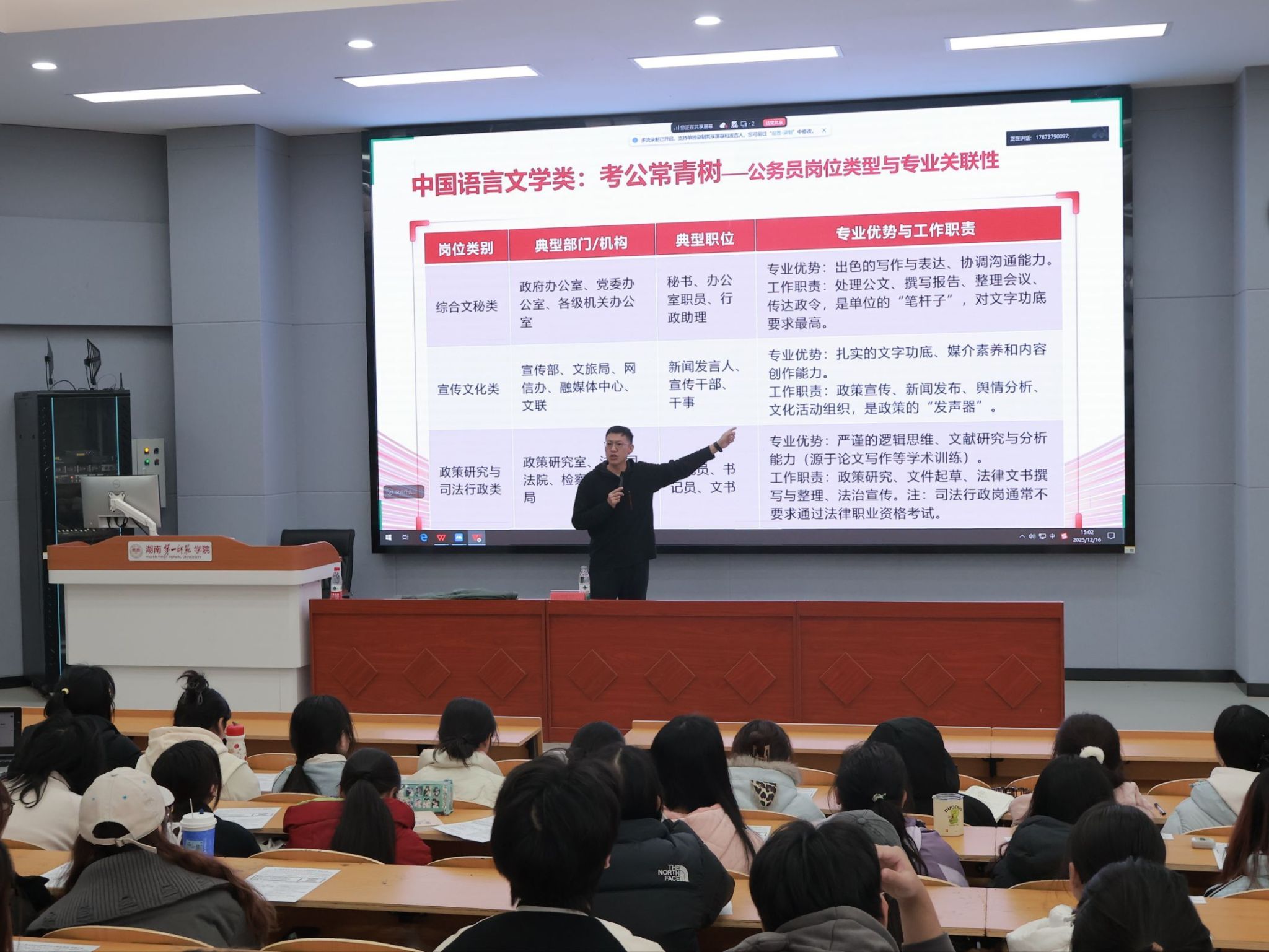 的专业优势,剖析了中国语言文学类与新闻传播学类在就业方面的适配性。中国语言文学类和新闻传播学类皆为国家公务员考试的热门专业,拥有较强的文字处理、语言表达以及政策理解能力,故而在公务员考试中具备一定优势。然而,仍需提前做好准备,对行政职业能力测验和申论写作能力进行系统性训练。针对考研群体,李豪杰指出,热门方向如现当代文学竞争激烈,部分考生高分落榜现象频发。建议同学们在择校时避免扎堆报考一些热门高校的学科语文方向,可考虑地域性强且就业衔接好的院校,同时充分利用夏令营等方式提前获取推免信息或是学校图书馆考试在线平台等资源提升备考效率。针对考取教师编制的群体,李豪杰建议同学们提前了解各地教师招聘政策,关注编制岗位的地域差异与专业要求,避免盲目报考。同时要注重教学实践能力的积累,积极参与微格教学、教育实习等环节,提升试讲与说课水平。