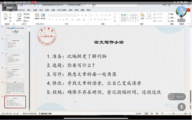 李杨老师以其对文学的热爱为根,以其自身丰富的文学实践经历为脉,将林建法老师的文学贡献、论文写作的要点以及文学创作的精髓等编织成为繁茂的文学之树。他深刻细致的分享让同学们对论文的选题、构思、行文等方面有了更深的了解。