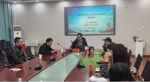 与青年教师开展学术座谈。座谈由院长龙永干教授主持,湘潭大学雷励教授、杨水远副院长及汉语国际教育系教师参与此次座谈。