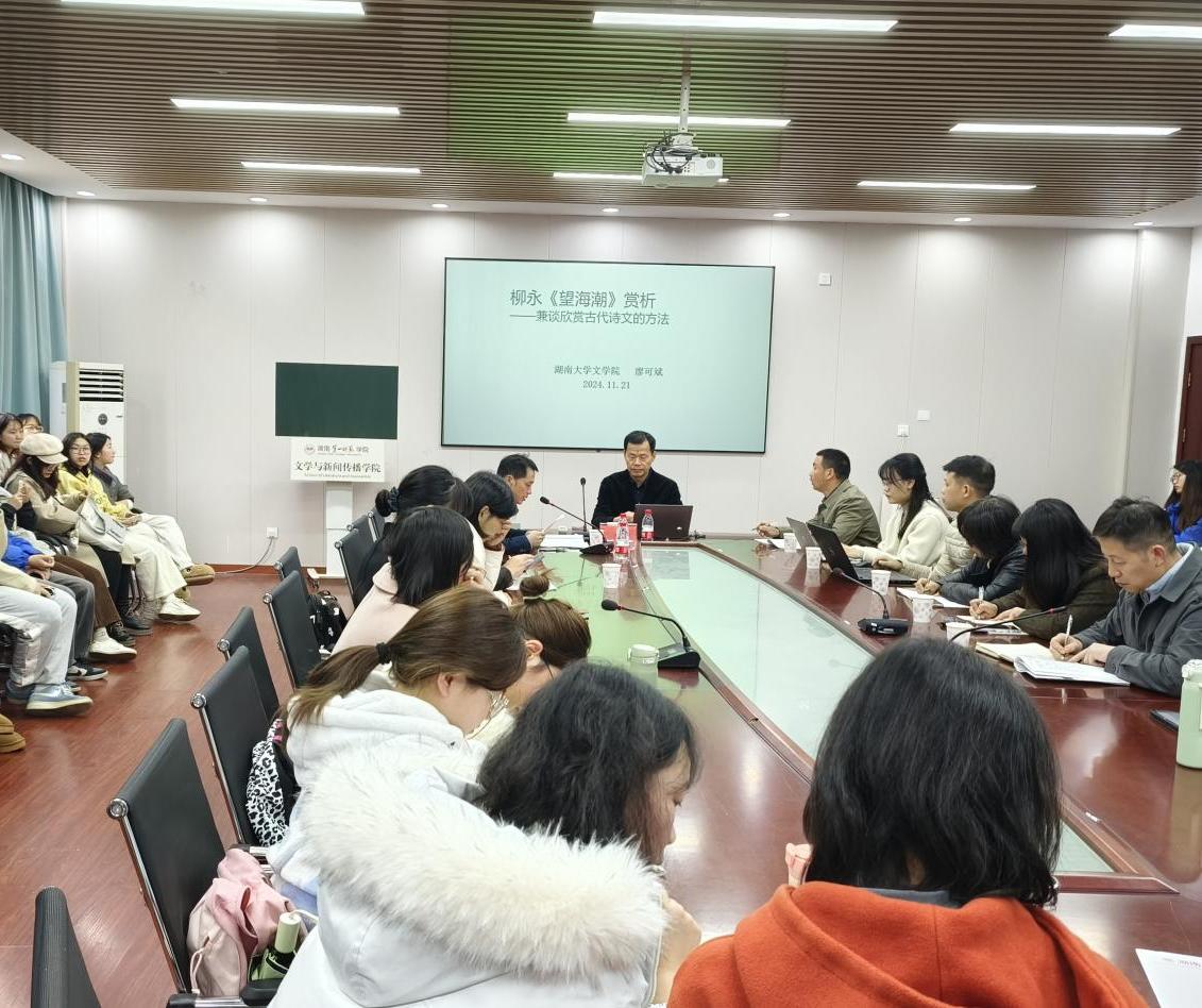 2024年11月21日,湖南大学文学院廖可斌教授应邀来院开展题为“柳永《望海潮》赏析——兼谈欣赏古代诗文的方法”的学术讲座。脱裤吧