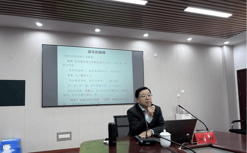 讲座中,刘利教授从汉语复句研究的学术争议切入,指出古今汉语中“既然”句与“如果”句在古今实际语言使用中存在逻辑纠葛,学界对二者的句法功能、语义边界等问题尚未形成统一认识。他从具体语言事实出发,同时运用语言对比揭示了“既然”与“如果”使用的混用情况,从语义的“认知尺度”“假设度”揭示了“既然”“如果”语义表现相似度高,与“因为”差异显著。