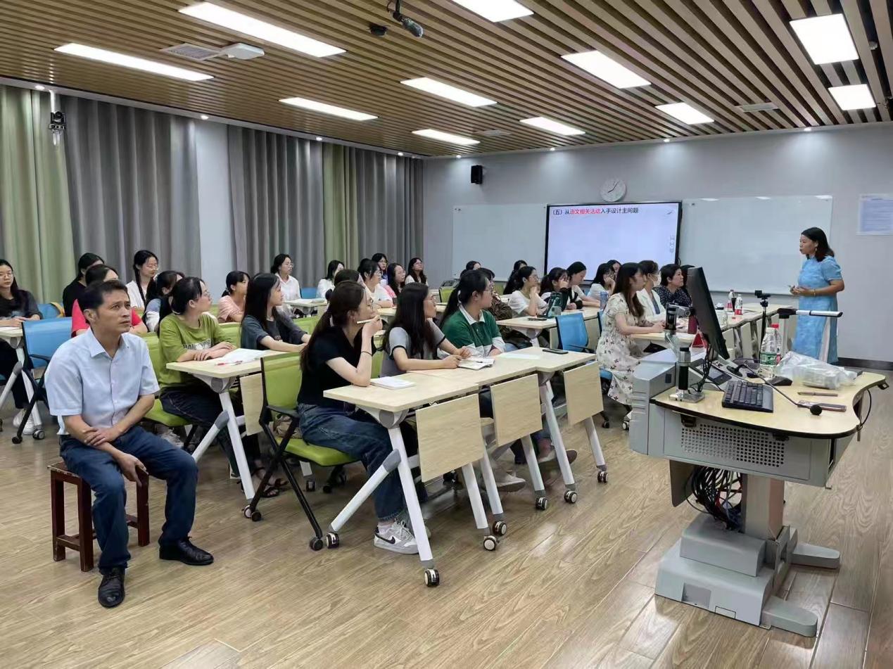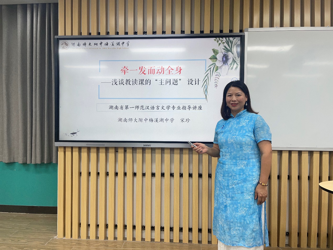 宋老师以《牵一发而动全身——浅谈教读课的“主问题设计”》为主题,从个人的成长经历入手,生动演绎了“坚持学习”是如何引导一个年轻老师一步步从小学教师走向中学教师,从县城走向省城,走向卓越教师的心路历程,并由此引出此次讲座的核心内容——教读课的“主问题”设计。宋老师用清晰的理论阐述、丰富的教学实例,深入浅出地阐述了什么是教读课的主问题,主问题的设计意义,如何设计主问题以及使用时应该注意的事项。