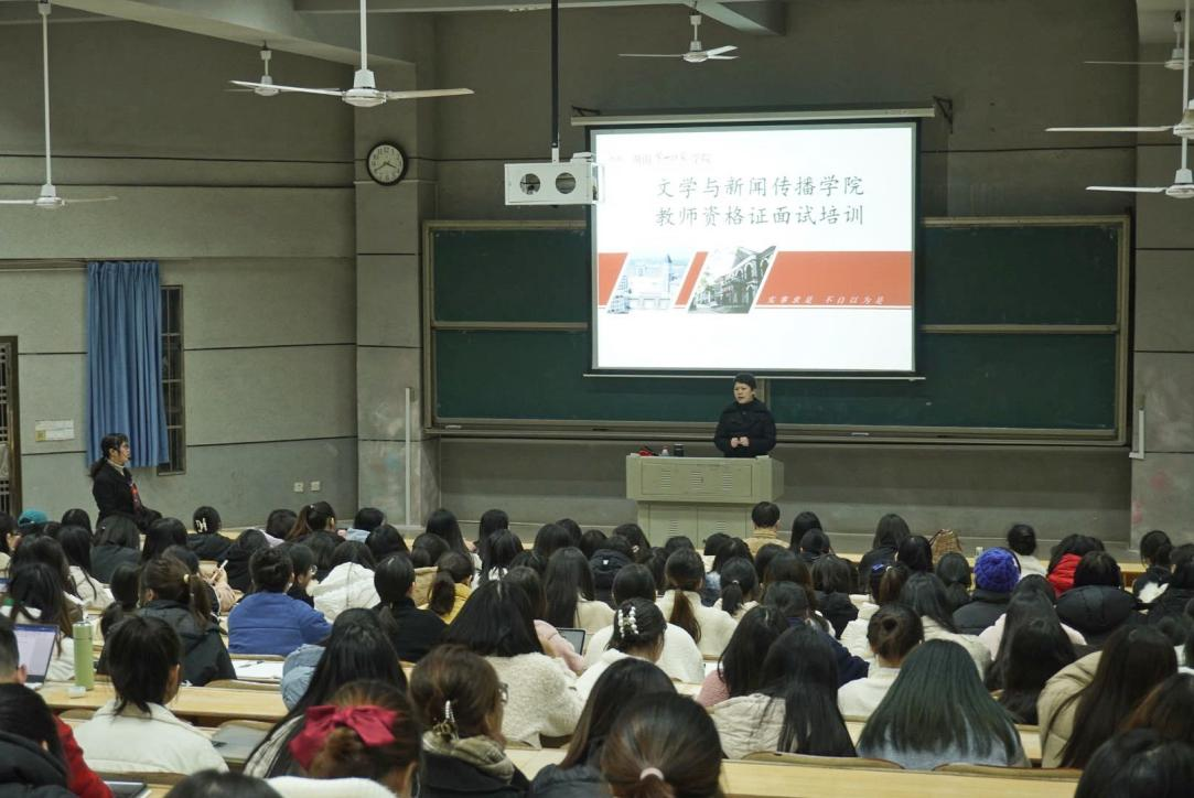 于12月20日在润寰南106教室举行了小学语文教师资格证面试培训讲座,本次讲座邀请了学院综合教研室主任、教师资格证面试考官周杨林老师进行专项培训。讲座由学院副院长罗燕主持,教务办主任李希光和团总支书记张忺寒出席本次讲座,学院2019级全体高招师范生及部分初招师范生参加了讲座。