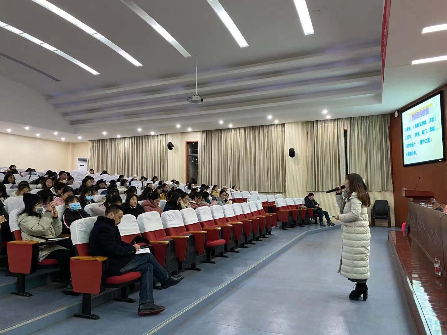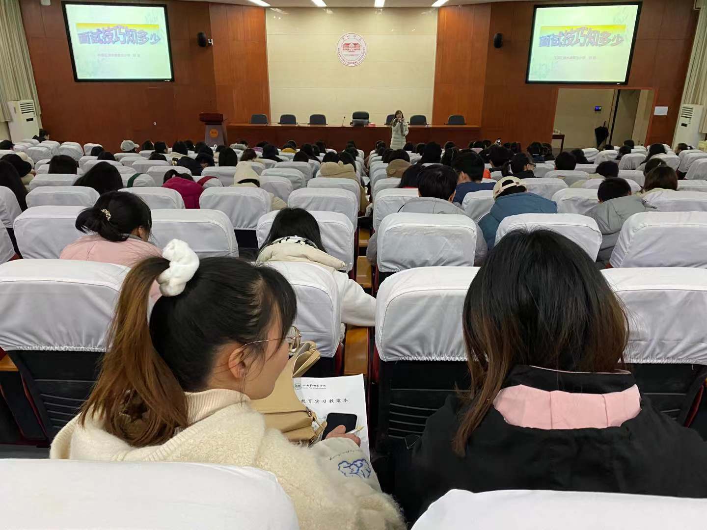 学生做题为“面试技能知多少”的讲座。副院长葛春蕃主持,2018级全体师范生参加了本次讲座。