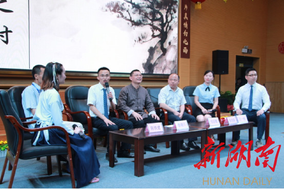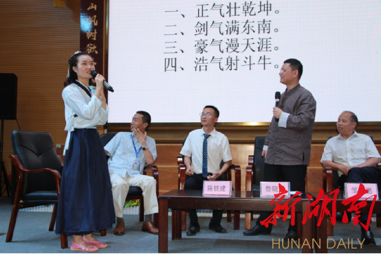 对联基地负责人、湖南省楹联家协会主席鲁晓川、湖南省楹联家协会副主席兼教育委员会主任邹宗德两位专家和1502班学生家长陈铁建一起带来沙龙——“议楹联之雅”,鲁晓川主席还现场为大家讲授对联知识。