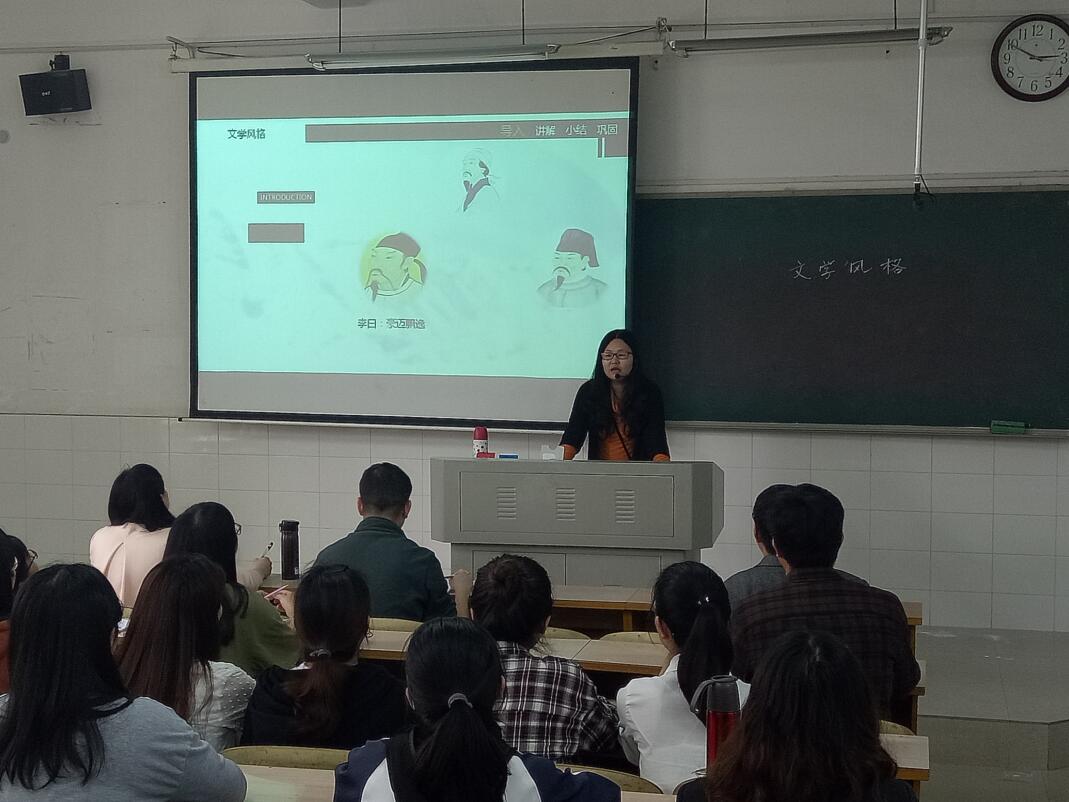 本次活动共有叶慧琼、杨雪梅、张惠、汤小红、刘晓云等五位教师参与,其中刘晓云老师23日下午在城南校区有课,未参与本次集中竞赛,改至26日上午单独考核。叶慧琼老师第一个上课,她主讲古代汉语,内容是汉字古今义的变化。叶老师语言精炼,上课内容浅显易懂;杨雪梅老师主讲内容则是外国文学名著《红与黑》,她首先从作者斯丹达尔简介开始讲述,然后具体分析作品的情节梗概、思想内容、于连形象等内容,语言风趣,内容充实,同学们对外国文学名著又有了新的理解;张惠老师主讲了文学风格,她从老舍、潘岳、拜伦等名家入手,阐释了文学风格形成的内在根据、基本条件、外部特征,将深奥的内容用浅显的语言表达出来,深受学生们喜爱;汤小红老师则从文学典型的定义、典型论的发展、文学典型的美学特征三个方面对文学典型进行了解读。