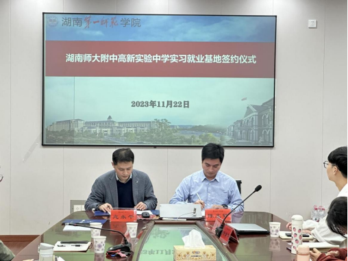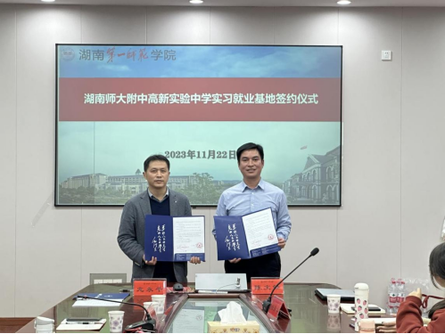 与湖南师大附中高新实验中学签订实习就业基地协议。陈文锋书记一再鼓励全体师生要不断学习和探索,要具备探索精神,适应时代,学会创新。他希望在座全体同学能够积极投身教育事业,为我国教育事业的成长和未来做出更多的贡献。