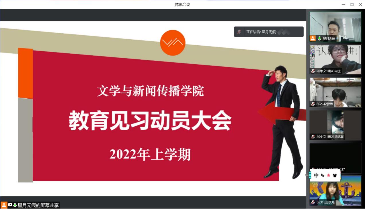 教育见习动员大会以腾讯会议的形式在线上召开,会议由院教务办主任李锴正主持,学院2020级高招师范生和2021级六年制汉语言文学专业学生共计569人参与了本次会议。
