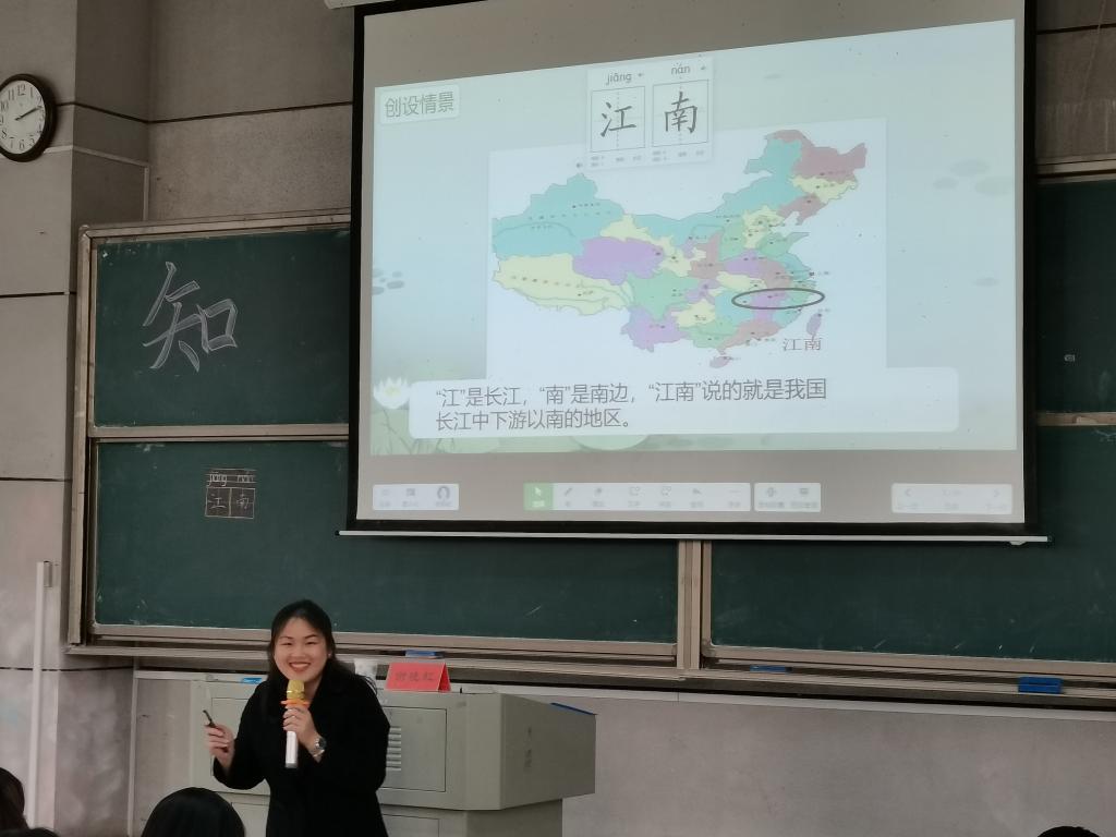 谢晓虹老师带来的是一年级识字教学《江南》示范课,她以亲切自然的谈话导入课文内容,紧抓“江南”两字,由课题入手,逐步深入识字内容。谢老师在课堂上辅以歌曲和游戏,让课堂变得“乐”起来。讲授生字时,注意联系生活实际,帮助学生理解字义字形。谢老师还随堂讲解教学方法以及教学策略,使学生们在上课的同时加深了对专业知识技能的了解。