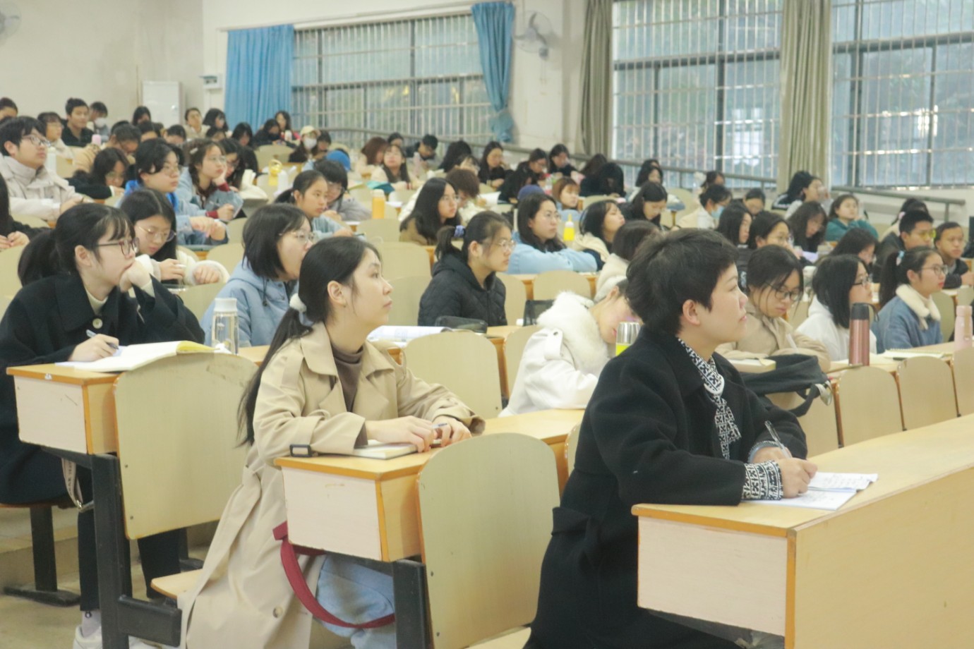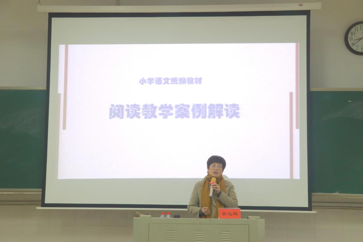 本报社(记者何小雨 摄影 郭翔宇)11月25日上午,“小学语文统编教材阅读教学案例解读”专题讲座先后在玉衡南101、201教室举行,主讲人为我校第一附属小学副校长余运群,讲座分别由脱裤吧