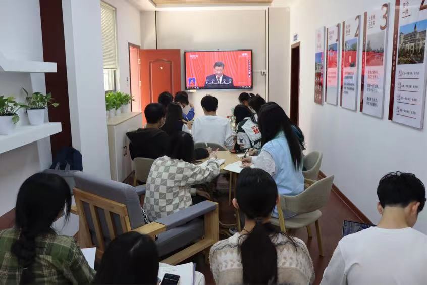 党委委员、班子成员、科室主任、辅导员、学生党员、学生代表在玉衡楼210和202研讨室集中收看,各教师党支部组织全体教师党员、各团支部组织2000余名青年团员集中在线收看。