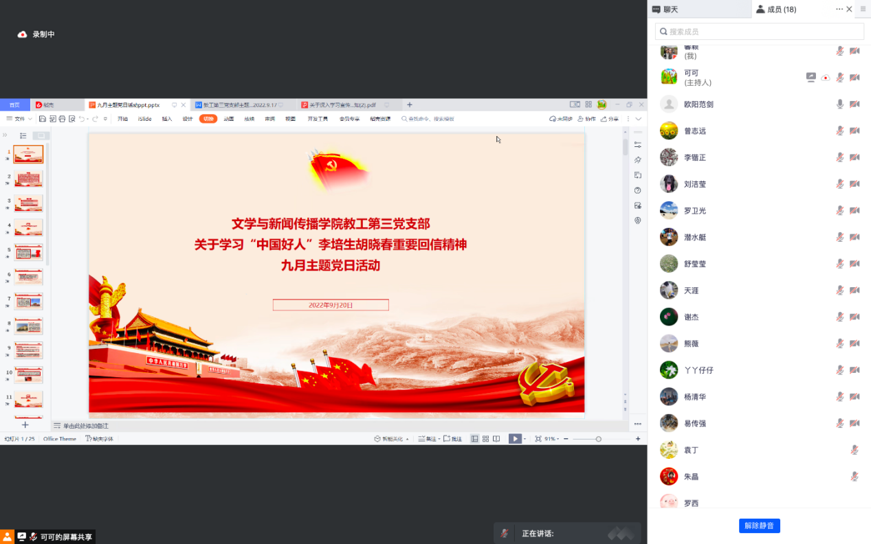 教工第三支部以腾讯会议的方式组织开展了9月主题党日活动。本次活动以“学习习近平总书记给‘中国好人’李培生、胡晓光重要回信精神”为主题,活动由支部书记谢亚可同志主持。