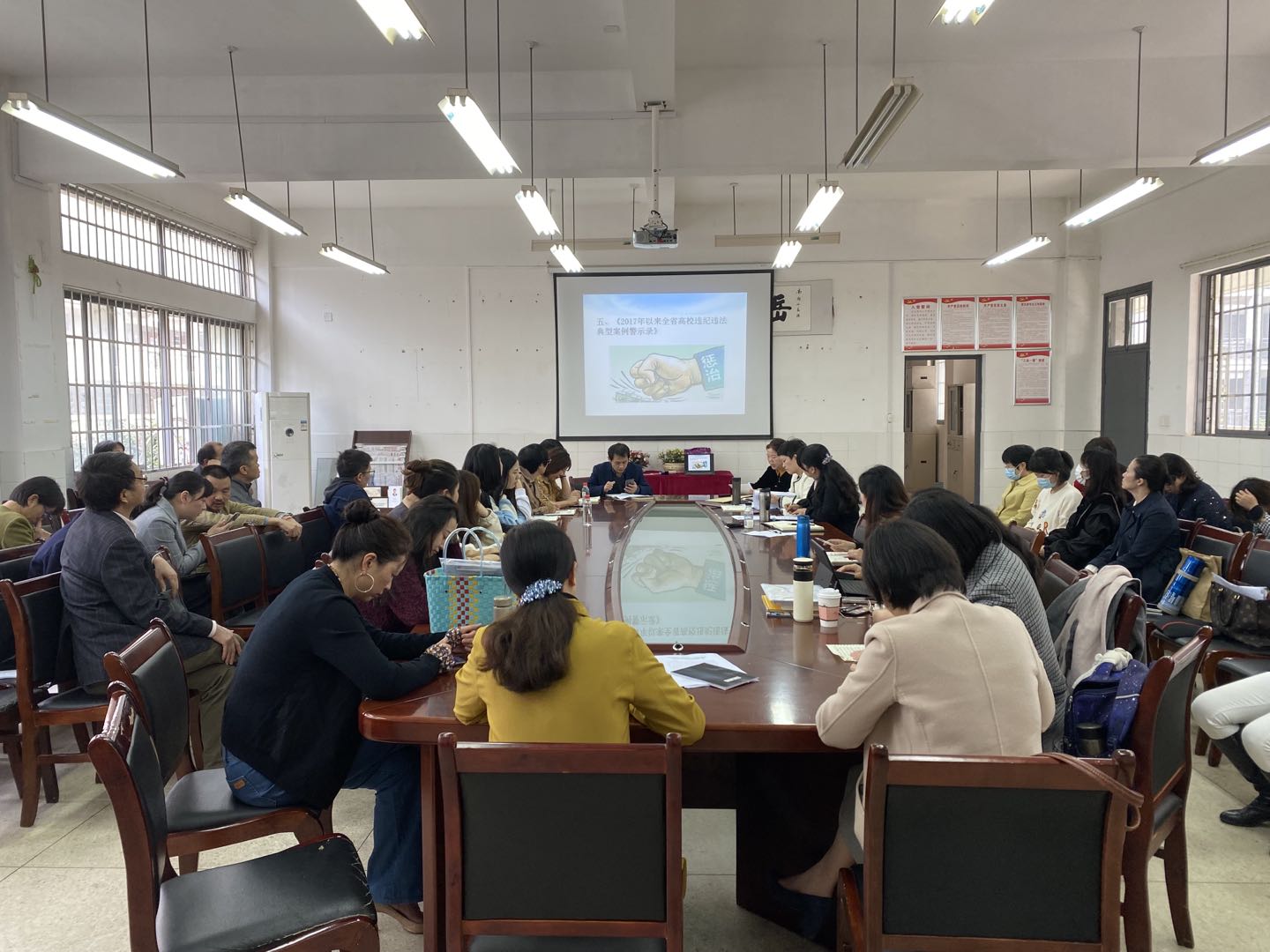 师德失范行为处理暂行规定”等文件精神。接着,陈书记就学院存在的师德失范的一些苗头性、倾向性的问题进行了通报,希望全院教师引起高度重视和警惕。最后,她宣讲了《2017年以来全省高校违纪违法典型案例警示录》,对13件典型案例进行的逐一宣讲和分析。目的是在全院师德师风建设中开展警示教育,“用身边事教育身边人”。