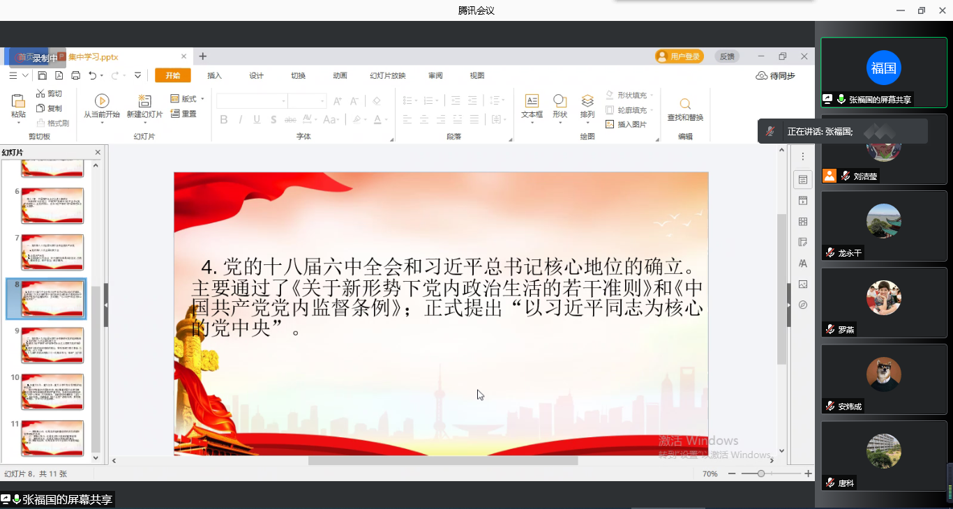 在本次集中学习活动中,张福国组织学习了本书第四篇的第十二章“中国特色社会主义进入新时代”, 从“党的第十八次全国代表大会和全面从严治党”“党的第十九次全国代表大会和新时代党的组织路线”两个部分展开分别介绍了在新时代征程上,中国共产党全面从严治党、全国组织工作会议精神、确立习近平同志为核心的党中央、全党的核心地位、确立习近平新时代中国特色社会主义思想为党的指导思想、推动全面从严治党向纵深发展、提出新时代党的组织路线、在重大工作、重大任务、重大斗争中充分发挥党的组织优势等一系列内容。张福国强调在习近平新时代中国特色社会主义思想的指引下,我们党坚持党要管党,全面从严治党,全党上下在思想上、政治上、组织上空前团结统一,党的各级组织和广大党员干部在推进新时代中国特色社会主义伟大事业中展现出了新的气象、新的担当、新的作为。