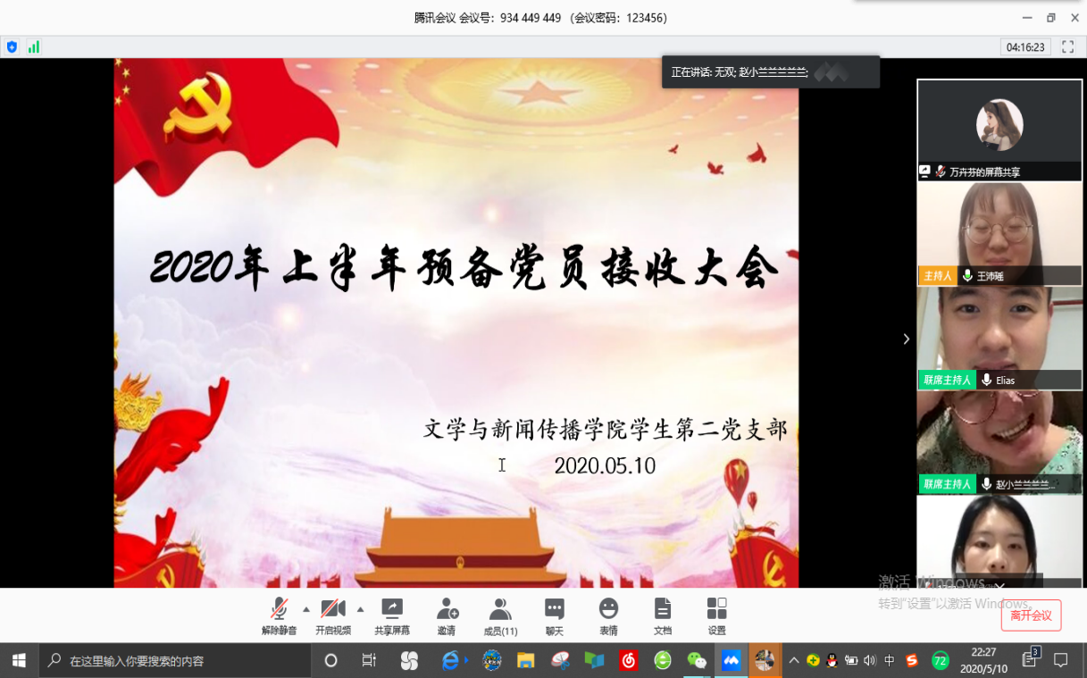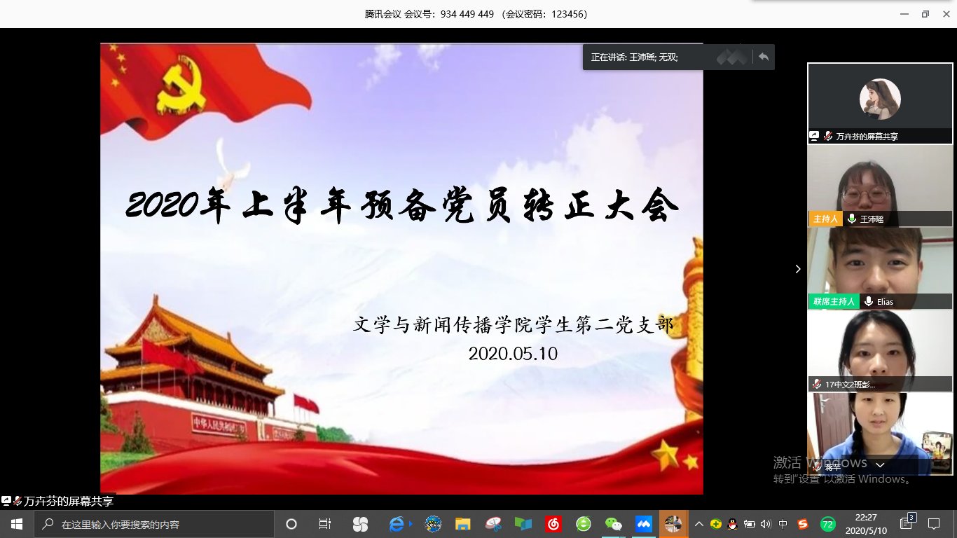 学生第二党支部以线上会议的形式召开了预备党员接收及预备党员转正大会。学生第二党支部书记安炜成老师、副书记赵雅兰老师、学生第二党支部全体学生党员和本批次的发展对象参加会议。安炜成老师主持本次会议。