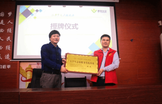 本报讯(通讯员 骆维娜)为弘扬志愿服务精神,打造区校共建大学生社会实践平台,我校共青团委员会与长沙市高新区麓谷街道麓泉社区共同实施“高校实践育人共同体建设项目”,5月31日下午,于麓泉社区举行大学生志愿服务实践基地授牌仪式。脱裤吧 党总支书记刘澍心教授、团总支书记张忺寒老师、麓谷街道党工委副书记文稳、党总支书记代立宪、社区主任尹双枚莅临现场,脱裤吧 青年志愿者协会全体成员、麓泉社区负责人及社区居民参与此次活动。