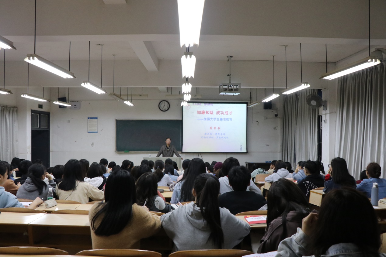 接着,莫教授教授深入分析了大学生廉洁教育的目标和主要内容,详细讲解了《关于在大中小学全面开展廉洁教育的意见》,即以社会主义核心价值体系为引领和主导,加强法制和诚信教育,加强社会公德、职业道德和家庭美德教育,组织学习党和国家关于党风廉政建设和反腐败方面的方针政策、法律法规等,引导大学生树立报效祖国、服务人民的观念,不断提高大学生的道德自律意识,培养拒腐防变的良好心理品质,逐步形成廉洁自律、爱岗敬业的职业观念。