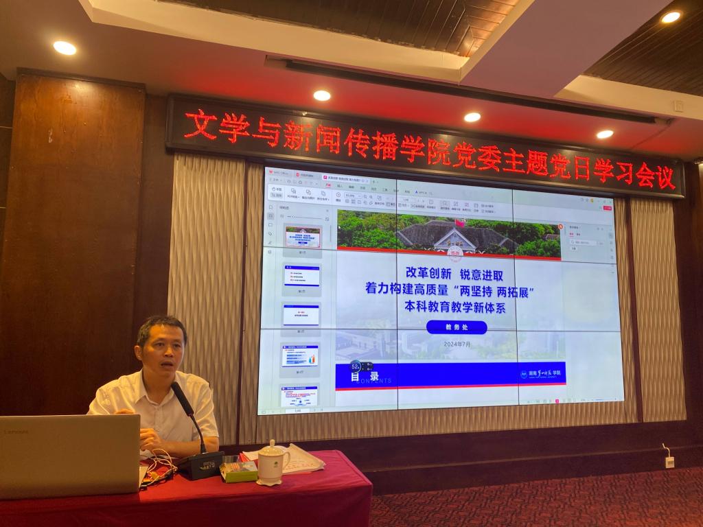 7月10日上午全体师生党员开展学习。院党委书记刘立勇为全体师生党员作题为《名校名师育名人》的专题党课,带领大家一起重温伟人故事、锤炼品德修为、不忘初心砥砺前行。刘立勇强调,在教育教学工作中应“以学促干”,落实习近平总书记考察我校时重要讲话精神,充分利用我校特有的红色文化资源,为党培养人才、为国家培育英才,传承红色基因,培育新时代的青年。院长龙永干重点传达了学校“改革创新 锐意进取 着力构建高质量‘两坚持 两拓展’本科教育教学新体系”文件精神,展示了学校教学工作的主要成效以及存在的主要问题,并结合学校的核心工作思路与策略,对学院暑期及下半年的重点工作进行了详细部署。副书记李豪杰作党纪学习教育,他详细讲述一系列违纪行为典型案例,加深党员教师对党纪的认识和理解,提高党员的纪律意识和自我约束能力。副院长杨水远作了《国家社科基金后期资助项目政策解读与经验分享》学科建设分享会,从国家社科基金后期资助项目、优秀博士学位论文出版项目、优秀学术著作再版项目等方面对教师科研工作进行指导。副院长张惠邀请青年老师赵姣作了《课程思政与教学内容融合的探索与实践》主题的教学分享会,从转变教育理念、更新教学内容、优化实施策略三个层次详细分享了教学探索和实践的宝贵经验。