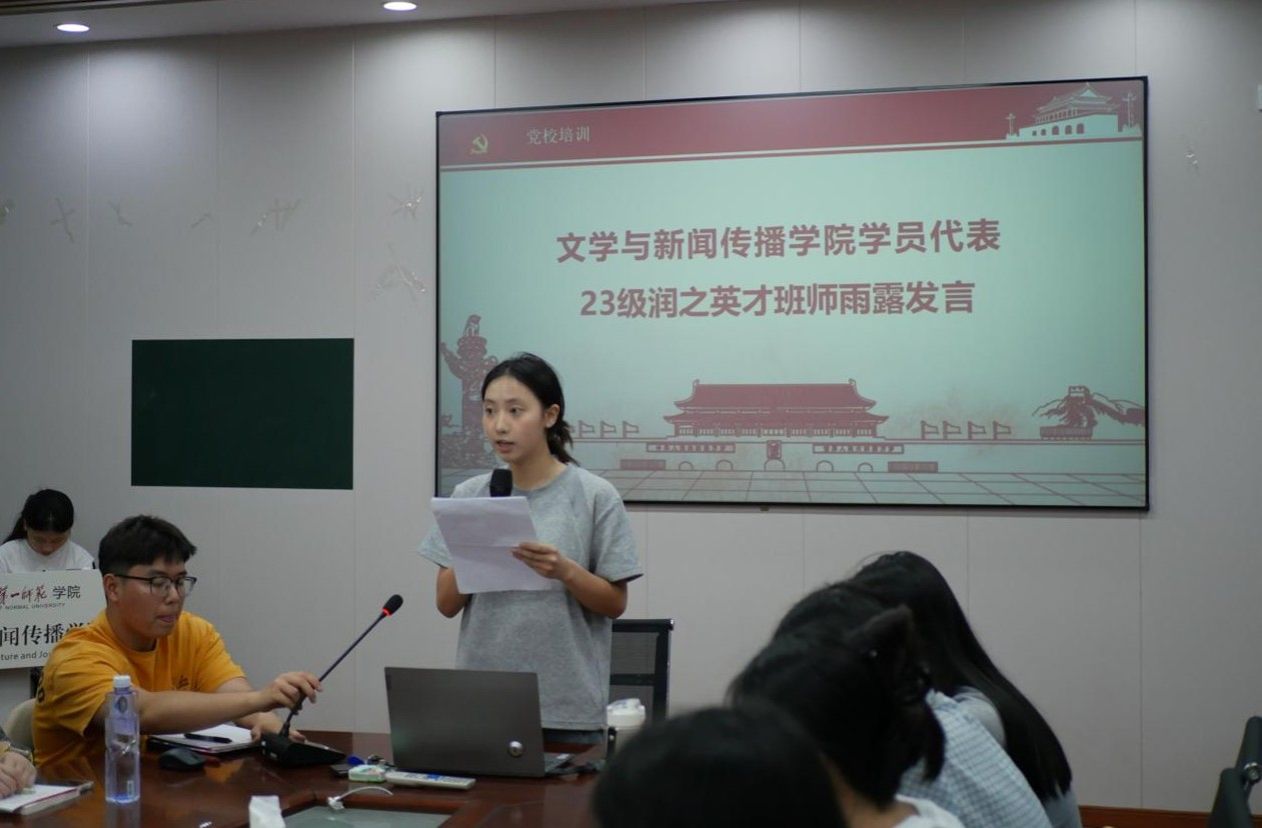 来自23级润之英才班的师雨露代表全体学员发言,她表达了自己坚定的入党之心,呼吁在座学员不断夯实理论基础,补足精神之钙,在学思践悟中擦亮初心,在奋发有为中践行使命,努力成长为担当民族复兴重任的时代新人。