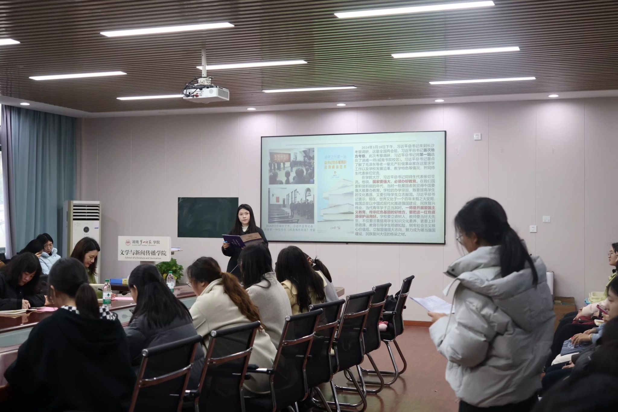 在交流环节,学生干部结合自身工作实际分享学习体会。24级润之英才班杨虹椿立足新闻宣传工作,表示将坚持严谨细致、精益求精的工作态度,严格审核把关,以优良作风带动团队成长;23级中文2班张茜提出要用好新媒体平台,策划“红色故事”“一师志愿者日记”等特色专栏,讲好红色故事与志愿故事,挖掘精神内涵,以实际行动践行习近平总书记殷殷嘱托。