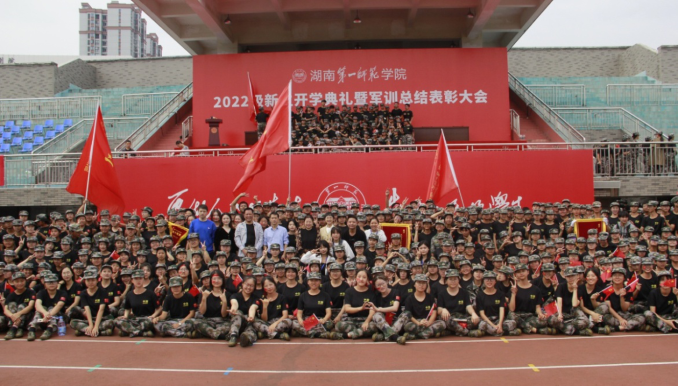 2022级新生开学典礼暨军训总结表彰大会在田径场隆重举行。校领导、有关职能部门和各学院相关负责人、全体2022级新生共同参与。