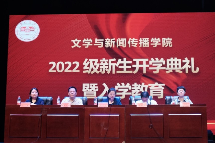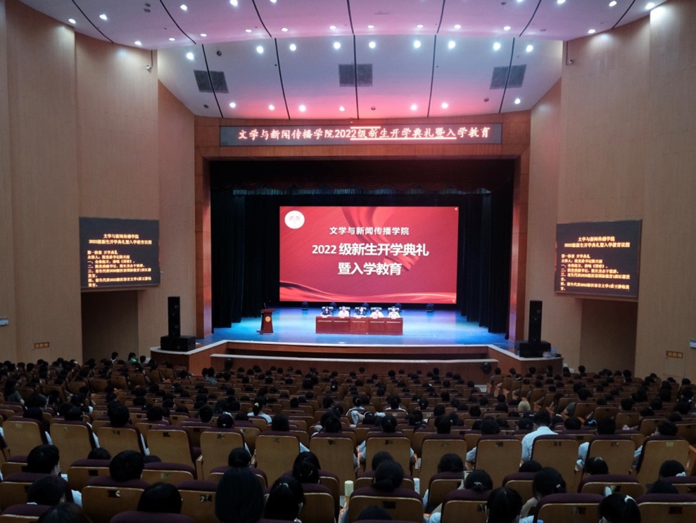 在田汉剧场隆重举行2022级新生开学典礼暨入学教育。院党委书记陈天涯,院党委副书记、院长龙永干,党委副书记欧阳范剑,副院长王霞、罗燕,学工办、党政办、教科办主任以及全体辅导员参加开学典礼。典礼由党委书记陈天涯主持。
