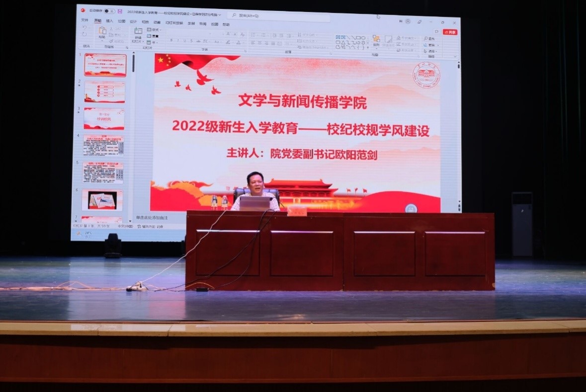 9月6日晚上,党委副书记欧阳范剑开展新生入学教育之校纪校规学风建设主题讲座。欧阳书记从政治纪律、学习纪律和日常管理规定三个方面重点宣讲了校纪校规,强调纪律既是底线,也是红线。他对学生管理提出高要求,要求学生强化自律、完善他律,要求学院严肃纪律、严格奖惩。