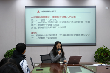 “做有情怀的记者,写有温度的新闻。”校记者站站长肖心仪在沙龙中提出撰写新闻稿要注重时效性与创新性,题目要夺人眼球抓住亮点。同时她也提供了一些关于新闻摄影的建议供大家参考。