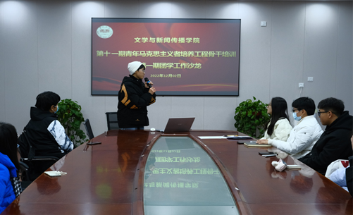 第十一期青年马克思主义者培养工程骨干培训暨第一期团学工作沙龙在玉衡楼201举行。本次沙龙邀请校新媒体中心主任、20级831中文班张晓翼和校记者站站长、20级825思政班肖心仪两位同学分享新闻稿撰写和推文制作经验。沙龙由学生会主席肖嘉玮主持。