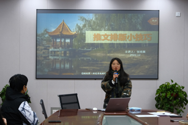 作为校新媒体中心主任,张晓翼同学拥有五年公众号推文制作经验,她分享了自己对于文案创作、色彩搭配、字号选择、推文排版等方面的见解,并结合官微的性质,指出在学院官方账号的运营过程中要做到找准定位,保持活跃度、提高影响力。