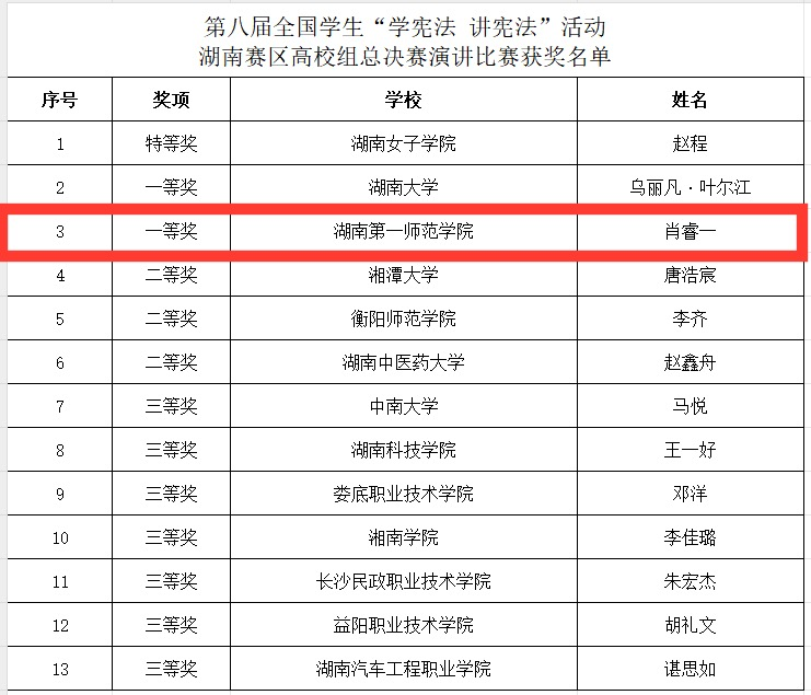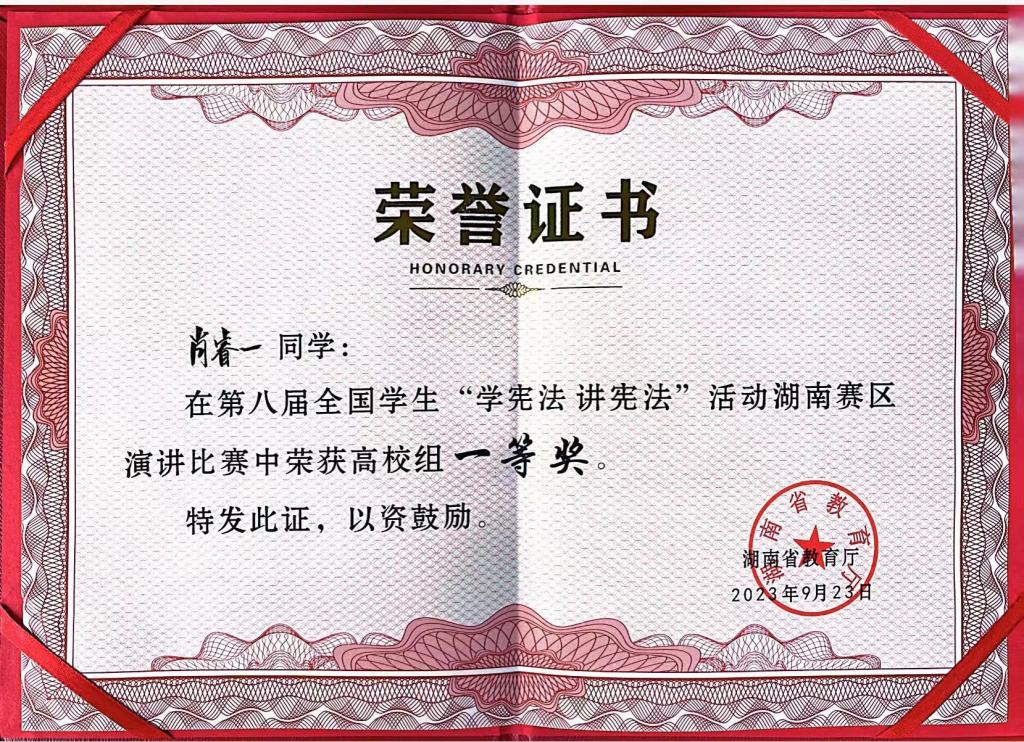 该活动由湖南省教育厅主办,湘潭大学、省法学研究基地承办,经过激烈角逐,最终来自各大高校的13名选手进入演讲组总决赛。肖睿一以《“宪”给你一生的守护》为题,讲述了盲人姑娘董丽娜在宪法的守护下成功逐梦的故事,并以此为切入点演讲,倡导大家自觉学法、守法、用法,让宪法精神真正内化于心,外化于行,做社会主义法治的忠实崇尚者、自觉遵守者和坚定捍卫者。