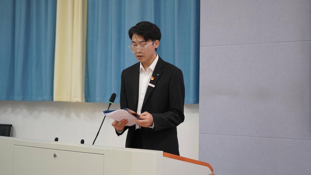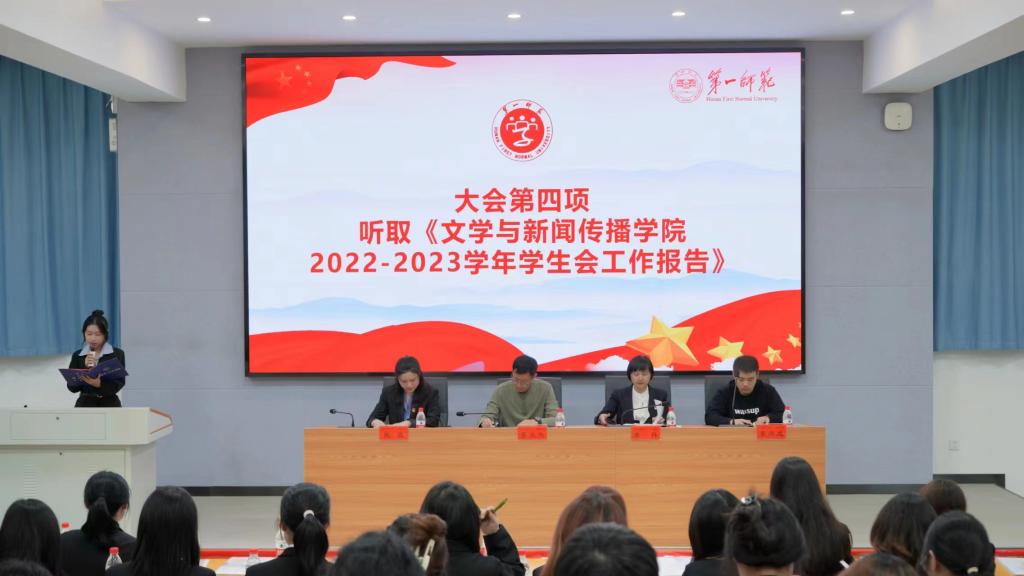 2022-2023学年学生会执行主席肖嘉玮作题为《厚德博学文以明道——在进一步建设“四个一师”的进程中彰显文传学子勇毅笃行之风貌》的工作报告。他回顾和总结了脱裤吧