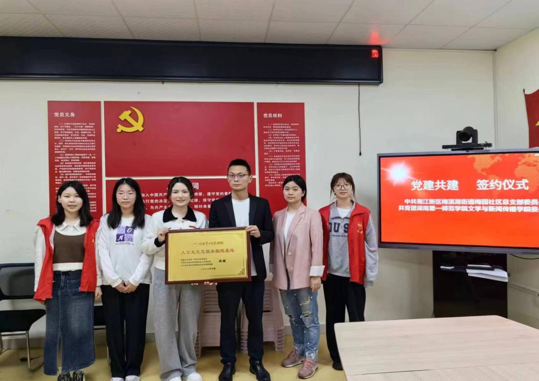 与长沙市岳麓区梅溪湖街道梅园社区签订合作协议,共建大学生志愿服务实践基地,打造实践育人共同体。院团委书记熊薇、梅园社区居委会副书记朱立志、院青年志愿者协会负责人等出席签约仪式。