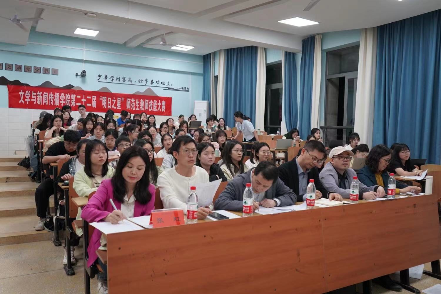 第二十二届“明日之星”师范生教师技能大赛决赛在怀中南106教室圆满落下帷幕。院长龙永干,党委副书记李豪杰、副院长周军、杨水远,综合教研室主任张虹、小学语文教学论团队周杨林担任评委,2021-2022级100余名师范专业学生现场观摩学习。