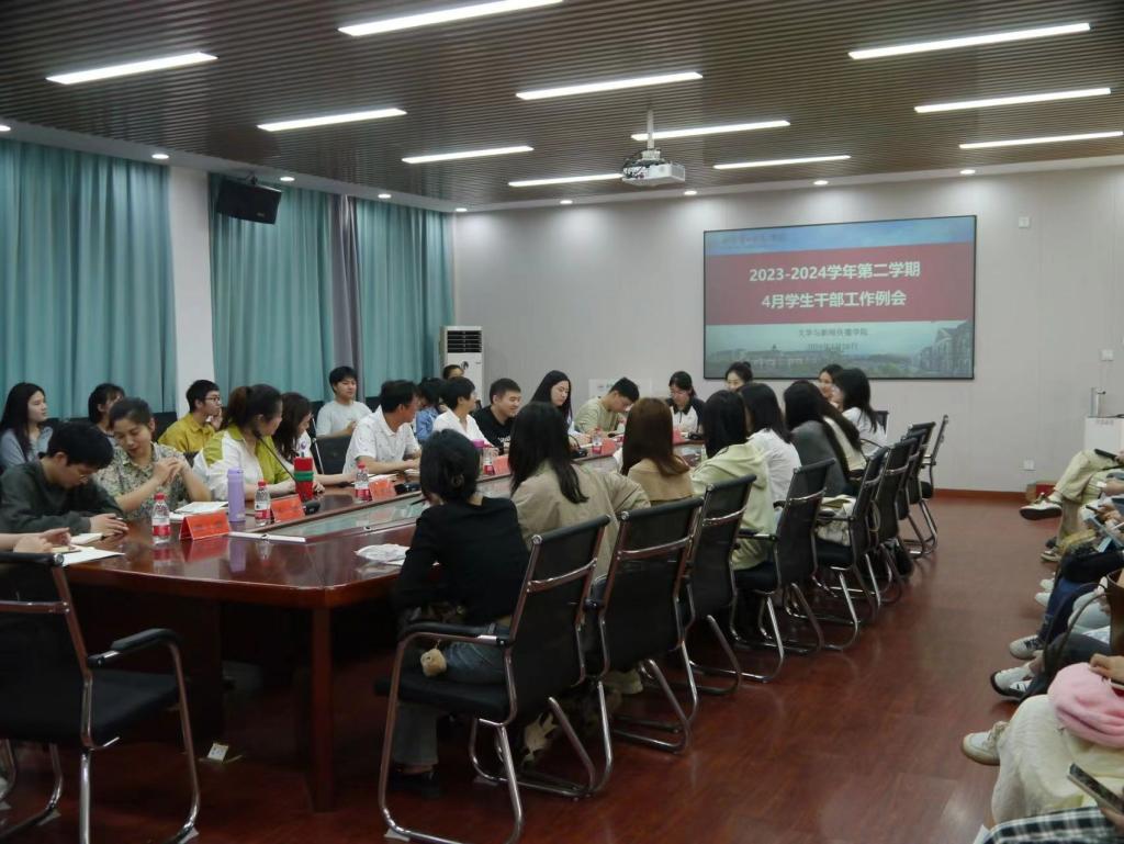 于玉衡楼201会议室召开2023-2024学年第二学期4月学生干部工作例会。院党委副书记李豪杰、全体辅导员及全体学生干部参与会议,会议由学生会执行主席刘苗苗主持。