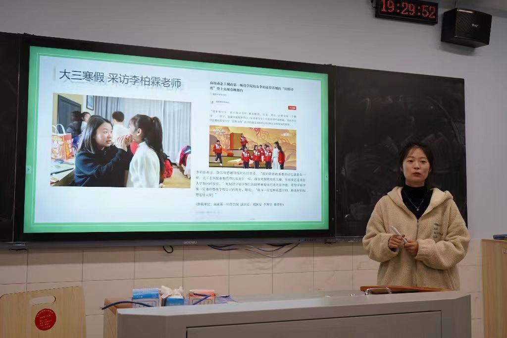 校报助理编辑,曾任校党委宣传部记者站采写一部部长。3月20日晚,李茜洁以《上课能否晚一点儿》为例,引出“观点应用事实阐述”的写作手法。她认为,写作的取材应从基础上升到专业,思维方式应从感性到理性,撰写稿件时要多用直接引语,用事实代替或表明作者的态度。她还分享了自己常用的新闻写作小技巧,如常使用客观、真实、感人的表述,或选取典型、有个性、能表达意义的事实,或采用适当的表述将细节写出来,也能够更生动地展现事实。