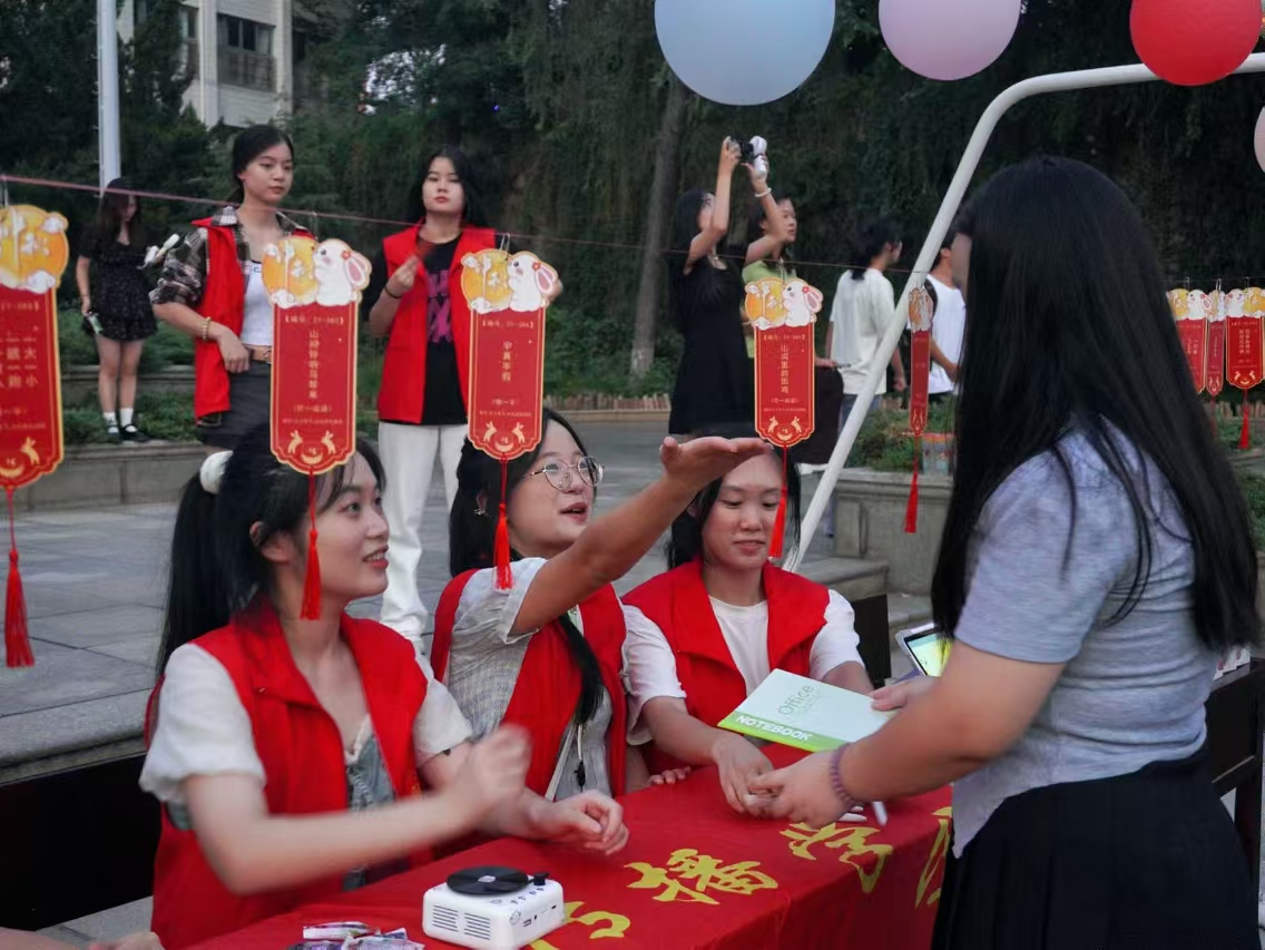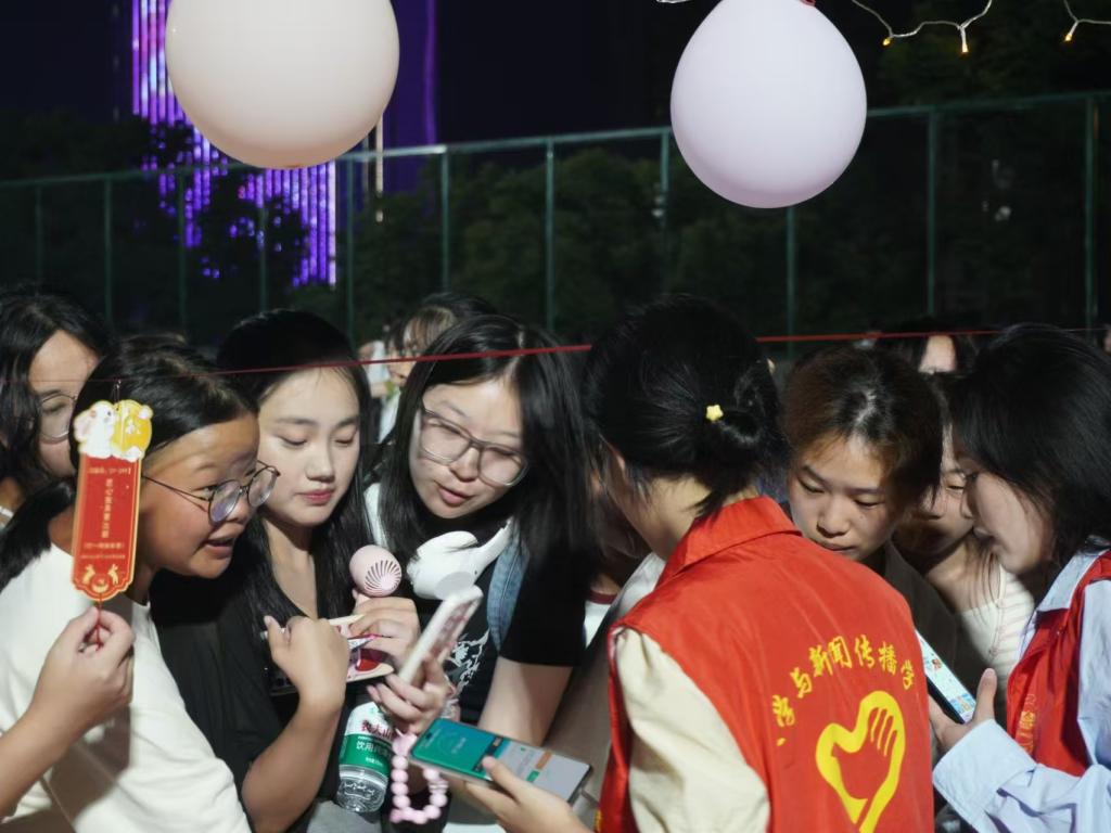 趣味灯谜,竞相抢答。传统文字与充满创意的 emoji 灯谜纸条在空中摇曳,极大地激发了同学们的好奇心和挑战欲。同学们围聚在灯谜下,或独自思索,或与伙伴们一同讨论着谜底,每当有同学猜出新的谜底,现场都会响起一片赞扬声。