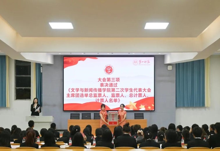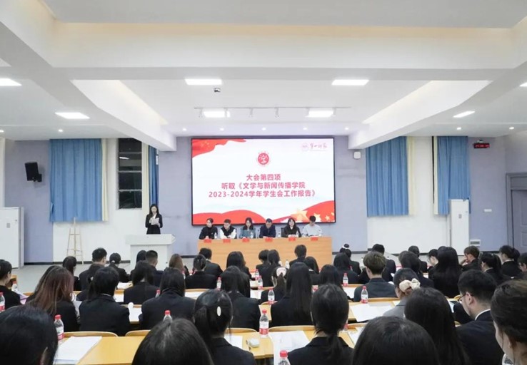 2023-2024学年学生会执行主席刘苗苗同学向大会作题为《厚德博学,文以明道在当好时代“大先生”,立志报国强国大志向的进程中文传学子不负青春使命,践行责任担当》工作报告。刘苗苗同学从七个方面系统地回顾和总结了脱裤吧