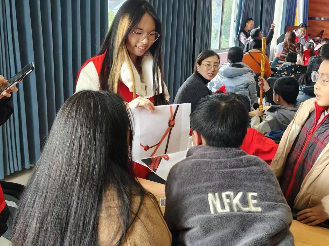 “这是‘日’字,它是代表团圆的中国结……”志愿者生动地为孩子们讲述了结绳记事的故事并介绍了绳艺编织中常见的样式与其寓意。
