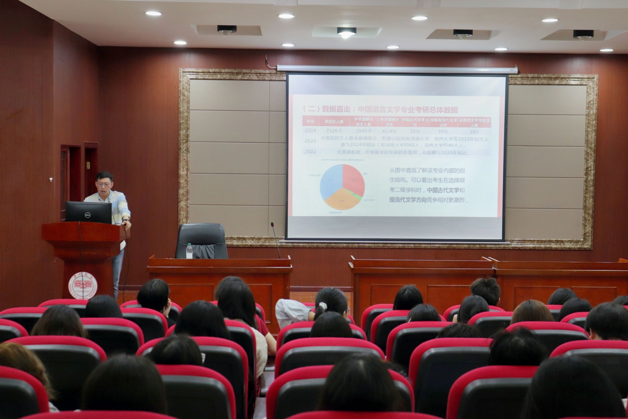 4月13日,李豪杰面向全体23级学生召开“聚焦文科就业风向,解锁成长发展密码”主题班会。班会上,李豪杰围绕“生涯赋能”“职途剖析”“破局之道”三个维度展开演讲。他通过精准的数据、直观的图象与翔实的事例,深入分析了近年来考公考研报考与录取比例、中小学语文教师招聘岗位竞争情况,以及未来四年相关专业毕业人数趋势,引导大二同学们认清竞争激烈、机遇与挑战并存的专业发展形势。