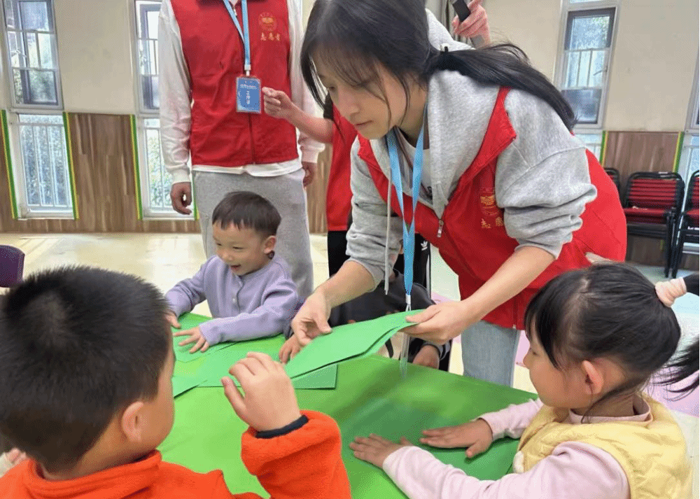 《霜降谣》旋律响起,“霜降来,霜花白,柿子红,树叶摆……”志愿者带孩子们拍手打节奏,晃着身体模仿树叶飘落,稚嫩歌声盈满室内。歌声歇,孩子们手捧“霜花”,镜头定格下这满是节气韵味的瞬间。