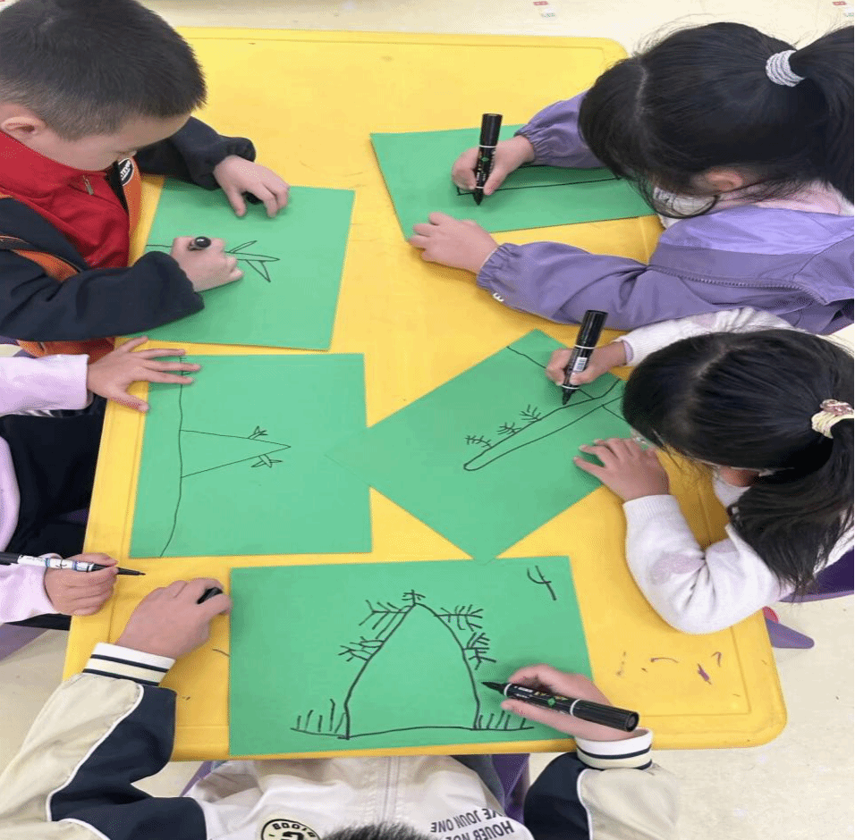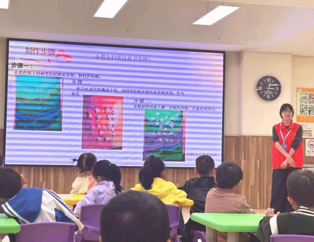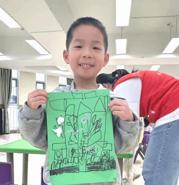 手工桌上,彩色卡纸、白色皱纹纸、银色闪粉整齐摆放,志愿者手中的成品格外亮眼——翠绿树枝、金黄草地间,白皱纹纸碎片缀满角落,撒上闪粉如粼粼“霜花”。“先画树枝草地,再贴皱纹纸当霜花,最后撒闪粉。”志愿者耐心示范,孩子们动笔勾勒秋日场景,有人小心撕纸,有人专注涂胶。“老师,我的霜花好看吗?”五岁的婷婷举着作品,眼睛亮晶晶。志愿者撒上闪粉,作品瞬间晶莹,孩子们嘴角上扬,绽放出灿烂的笑。