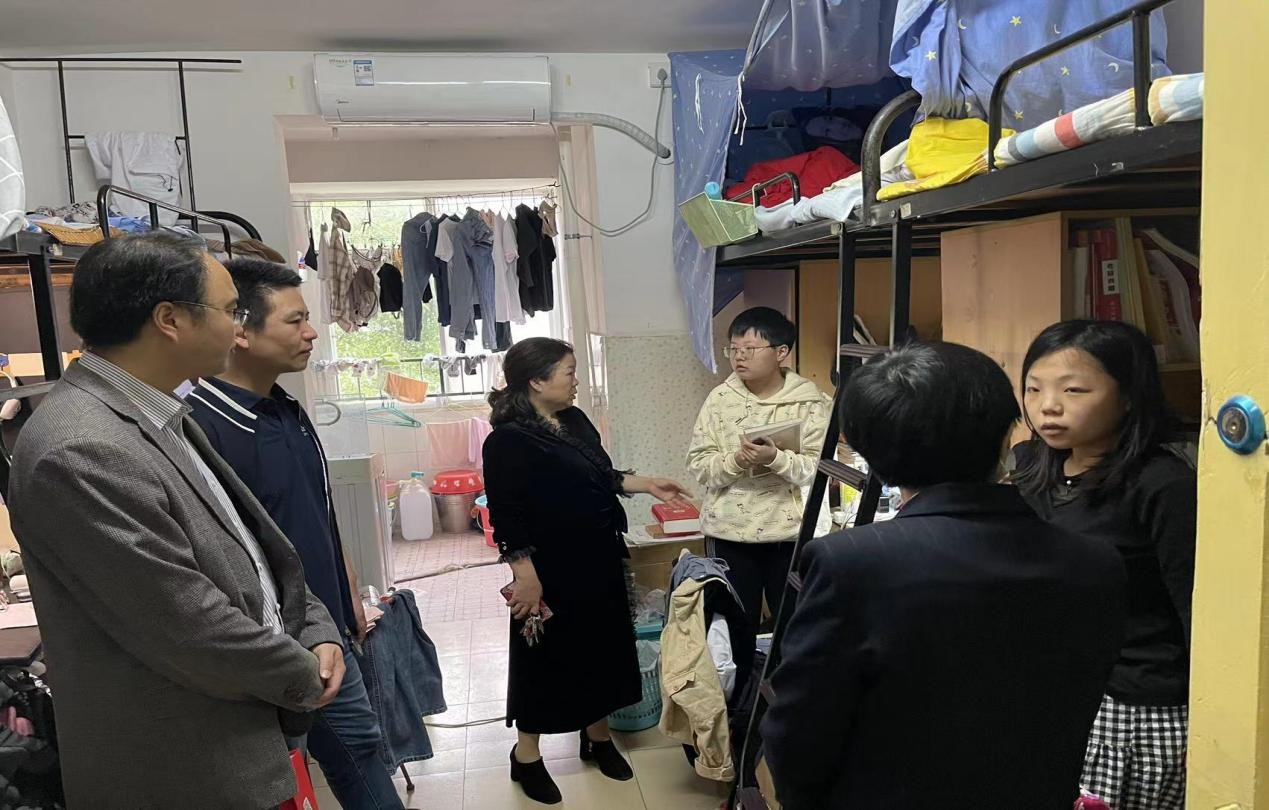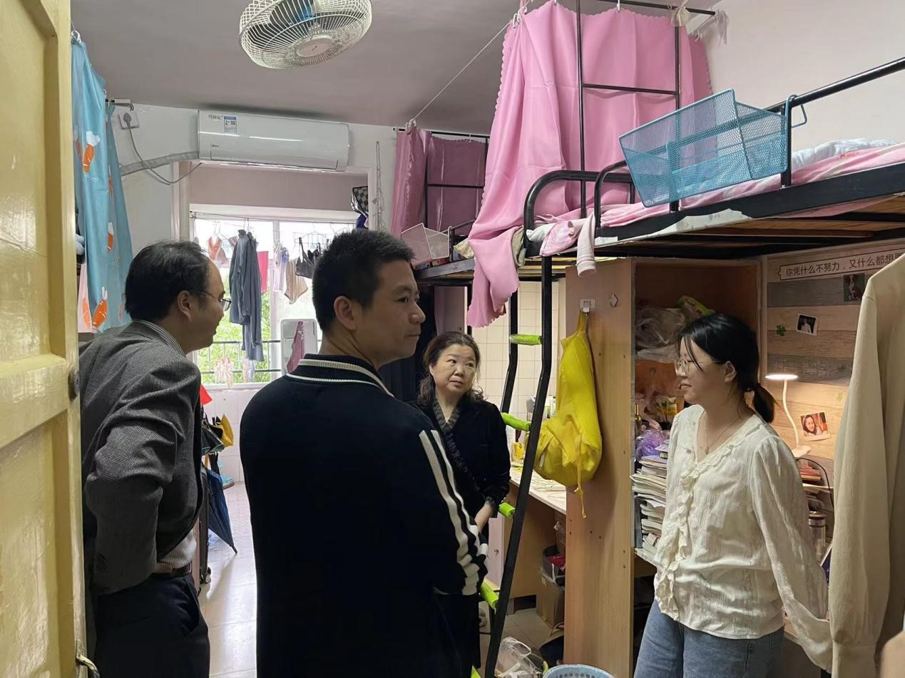 5月19日下午,脱裤吧 党委书记陈天涯带领汉语国际教育系主任王正、学工办主任唐科、辅导员曾志远、安炜成、舒莹莹走访了毕业班寝室,根据当前的经济情况提醒同学们充分认识就业形势,抓紧就业机会,提高辨别力,增强竞争力,积极就业。