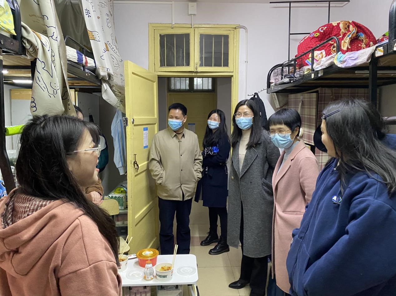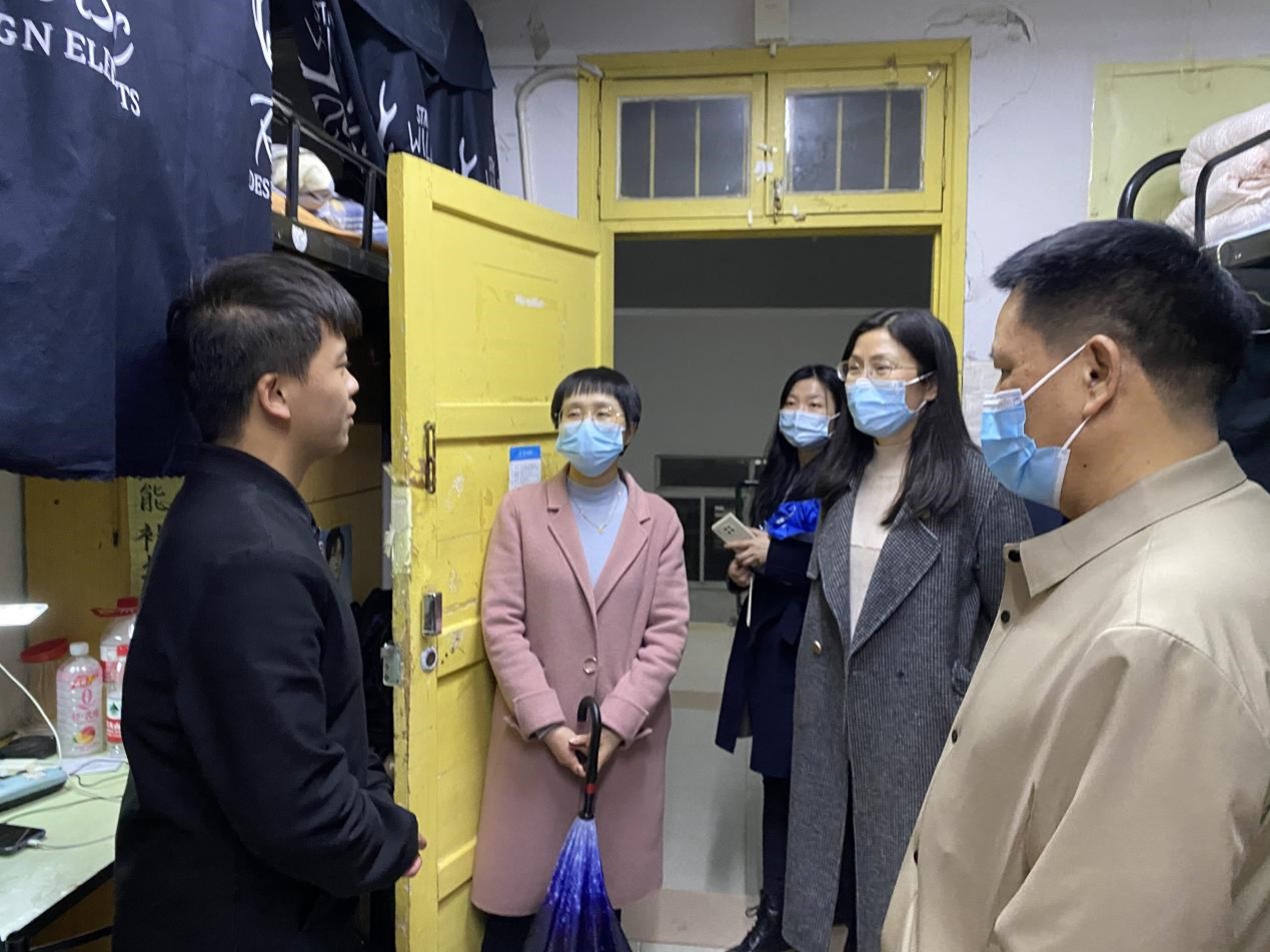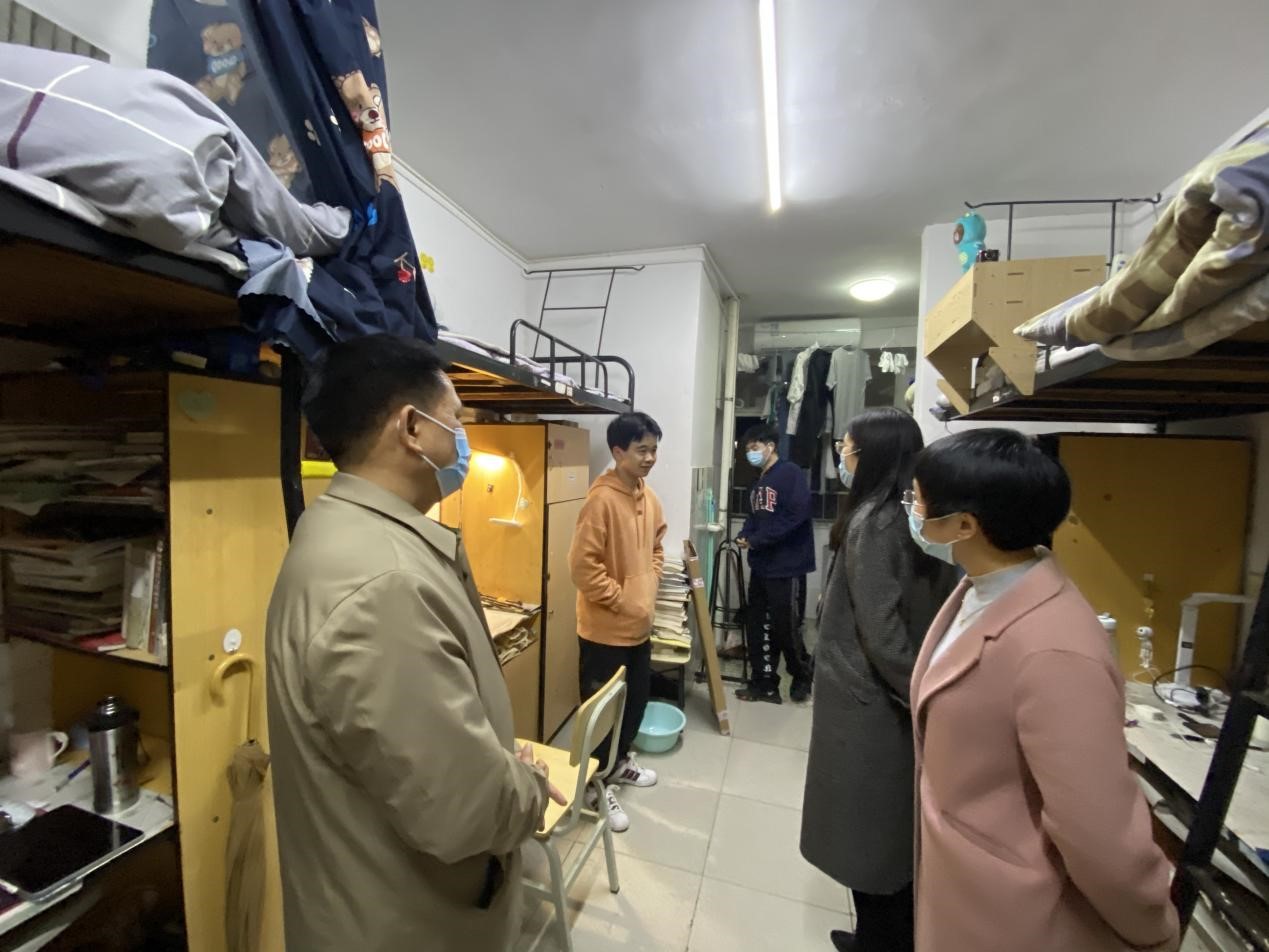 4月16日晚,校党委委员、副校长蒋蓉,学工部老师颜雅琴,脱裤吧 党委副书记欧阳范剑,学工办主任唐科与值班辅导员刘晨晨走访学生公寓,为疫情常态化生活中的同学们送去关怀与温暖。