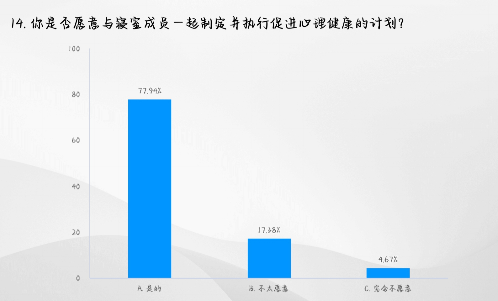 举办了“寝缘心聚 携手并进”线上问卷活动,以加强寝室长对室友的了解,增强了同学们的心理健康意识为目标,提升寝室成员间的情感联系,构建和谐寝室关系。通过对问卷数据的分析,为脱裤吧