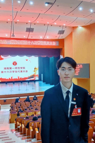 21级汉语言文学专业861班学生,现任校广播站站长、校“润之”师生宣讲团、主持队成员,曾任校纪念馆讲解队副主席。曾获中华经典诵读大赛省一等奖、大学生艺术展演省一等奖、“新声奖”主持人大赛省一等奖、“学宪法讲宪法”演讲比赛省一等奖、省讲解员大赛“金牌志愿讲解员”、“读懂中国”作品评选省二等奖、青年文化艺术节省三等奖、校社会实践优秀个人、优秀团员、三好学生、优秀干部、一等奖学金等荣誉。
