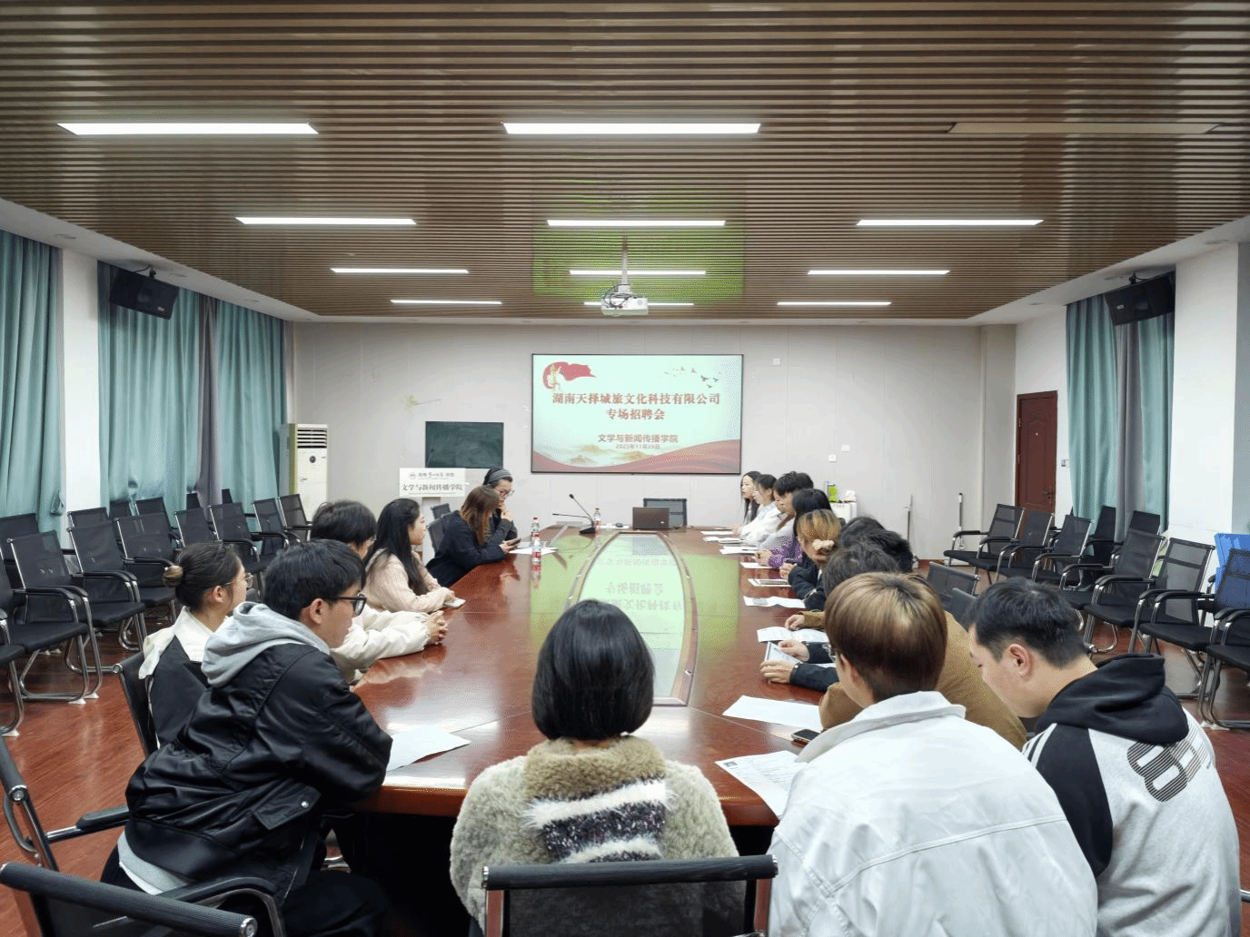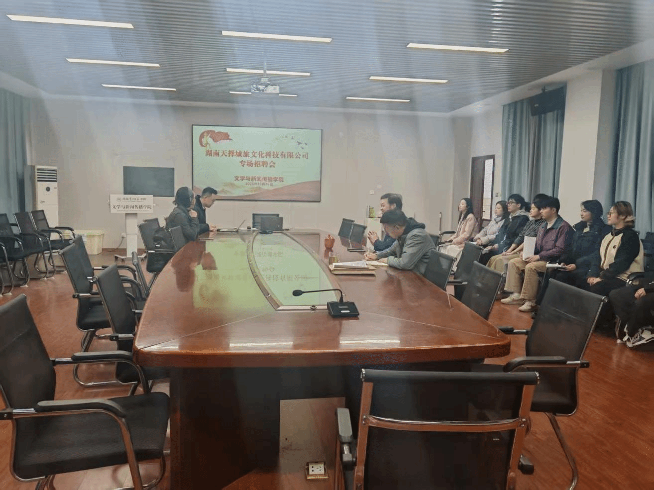 特邀湖南天择城旅文化科技有限公司在玉衡楼201举办专场招聘会。院党委书记刘立勇、院党委副书记李豪杰亲临现场指导,毕业班辅导员李倩、就业专干安炜成及来自脱裤吧