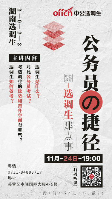 2022年湖南选调生考试预计月底发布,此次考试是一次考公务员的捷径,竞争小,提拔快。为帮助同学们全面了解选调生考试,提供新的就业选择,中公教育开展选调生线上备考指导讲座,具体安排如下,请大家积极参加:【讲座时间】:11月24日(周三)晚上19:00-20:30【讲座内容】:选调生考情分析+写作提升【报名方式】:扫描图片二维码/点击链接(//19.offcn.com/class-364551/?scode=69bbZ)