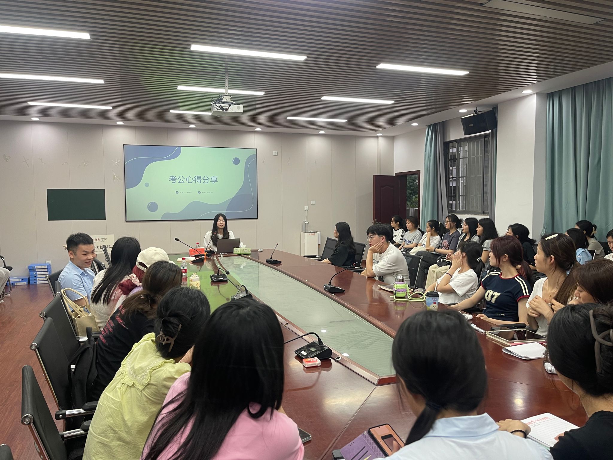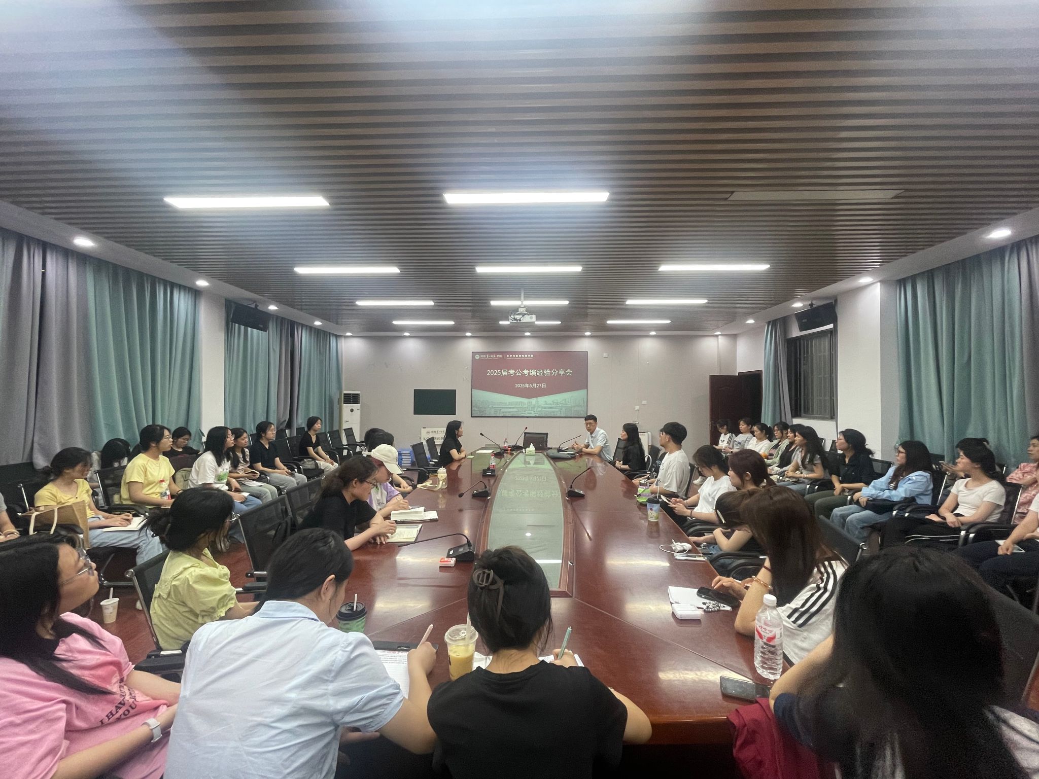 于玉衡楼201召开2025年考公考编经验分享会。学院党委副书记李豪杰,学工办主任王娜、副主任安炜成出席会议,各年级备考学生积极参与。