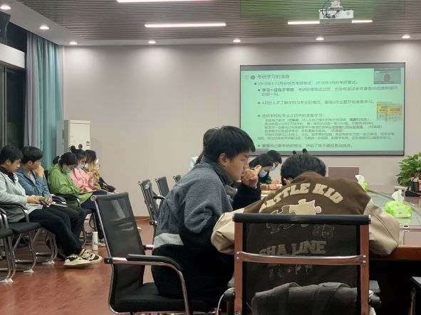 组织有考研意向的学生参与优秀校友唐佳丽、谢思成的考研经验分享会。基于疫情防控要求,分享会以线上线下相结合的形式举办,线下参与分享的学生在玉衡楼201进行学习。